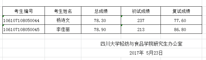 四川大学轻纺与食品学院纺研所2017年博士研究生招生入学成绩公示