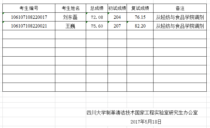 四川大学制革清洁技术国家工程实验室2017年博士研究生入学成绩公示