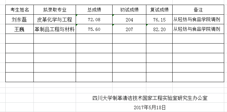 现将制革清洁技术国家工程实验室2017年博士研究生招生拟录取名单进行公示。如有问题或意见,自公示之日起十个工作日内,实名制反映至轻纺与食品学院纪委办公室。邮箱lxhqf@scu.edu.cn,联系电话85461730。此名单不包括非公开招考考生。