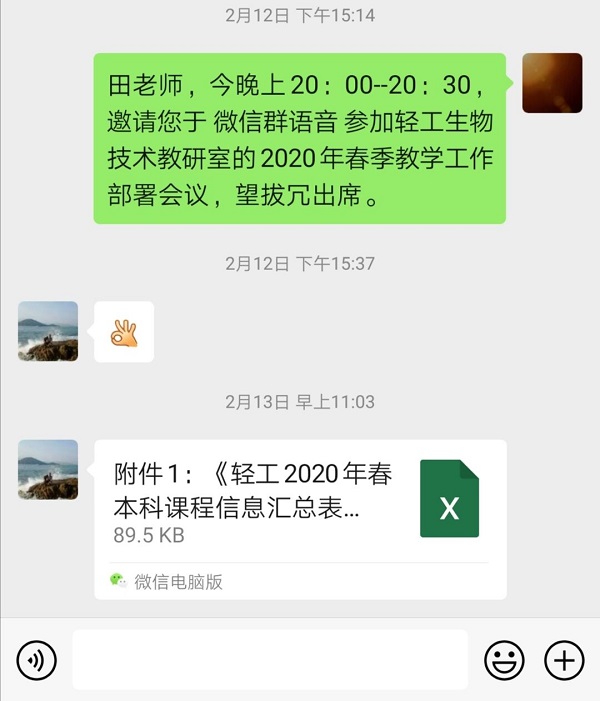 为更好地开展新学期教学工作,202021220:00轻工生物技术教研室利用微信语音召开了新学期教学工作安排交流会,教研室所有任课教师出席会议,会议由教研室主任周荣清老师主持。