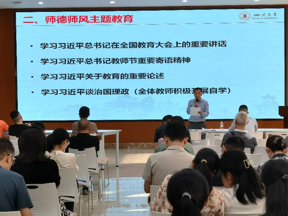 9月19日下午,bw必威西汉姆联官网在望江校区皮革楼工业互联网中心开展“以教育家精神铸魂强师,谱写教育强国建设华章”主题的师德建设宣传月活动。学院领导班子及全体教职工参加,活动由学院党委书记李天富主持。