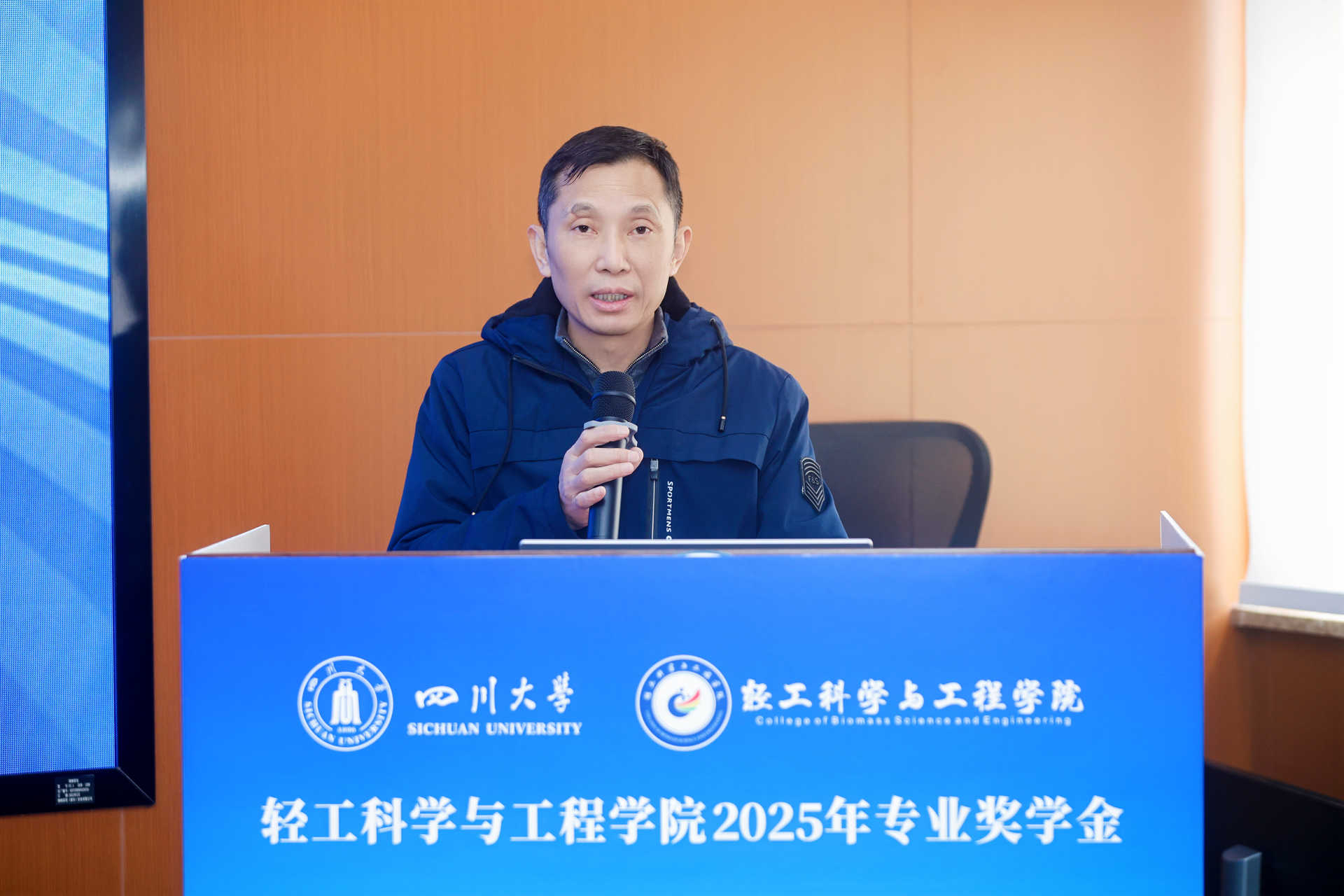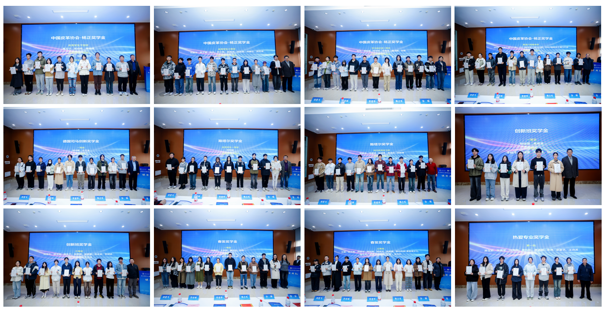 设奖单位代表陈占光副理事长致辞,他肯定了获奖同学的付出,高度评价了捐资助学对产教融合、人才成长的推动作用,同时寄语学子要夯实专业基础、培育创新思维,为皮革行业高质量发展和制造强国建设贡献青春力量。